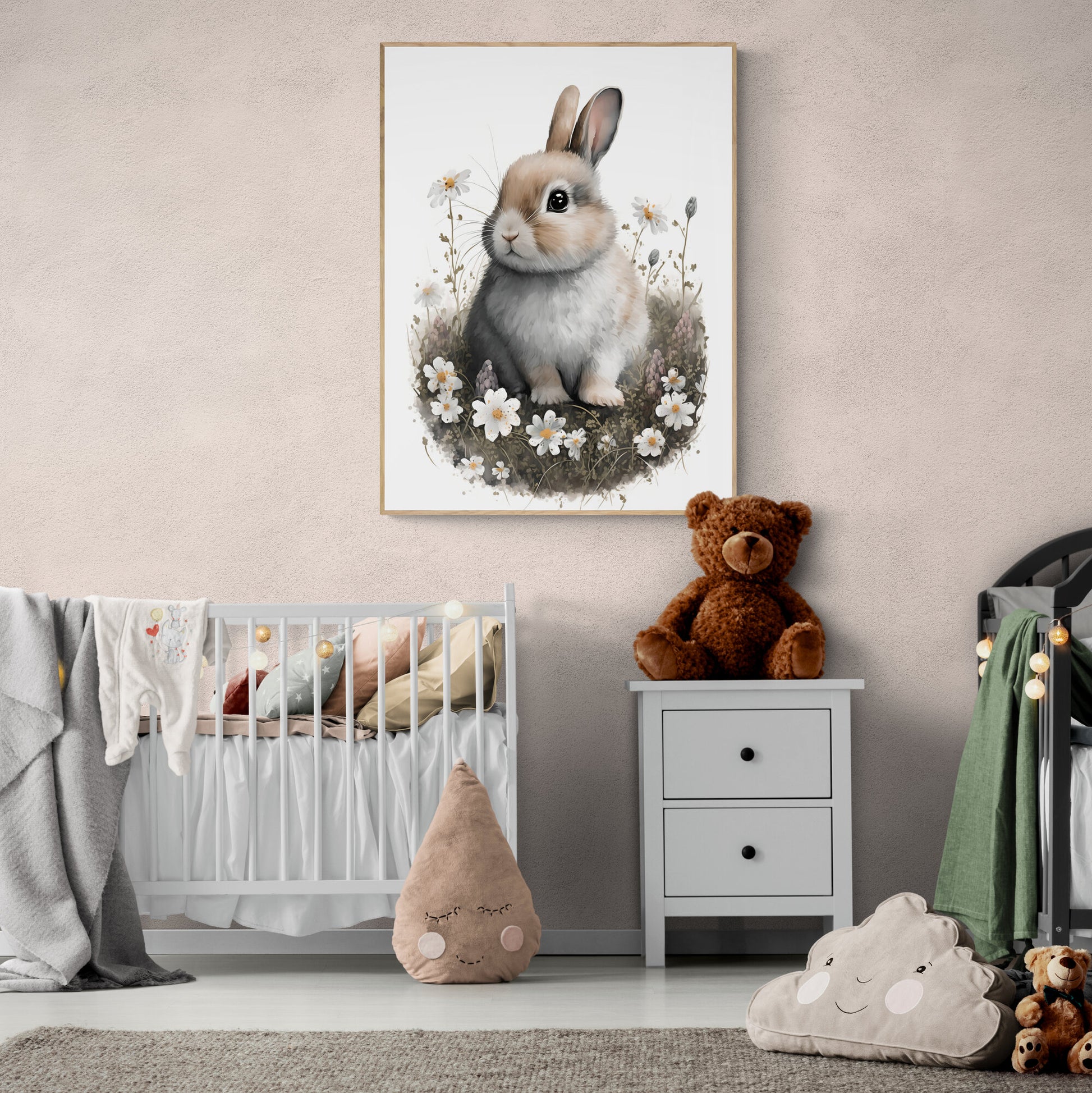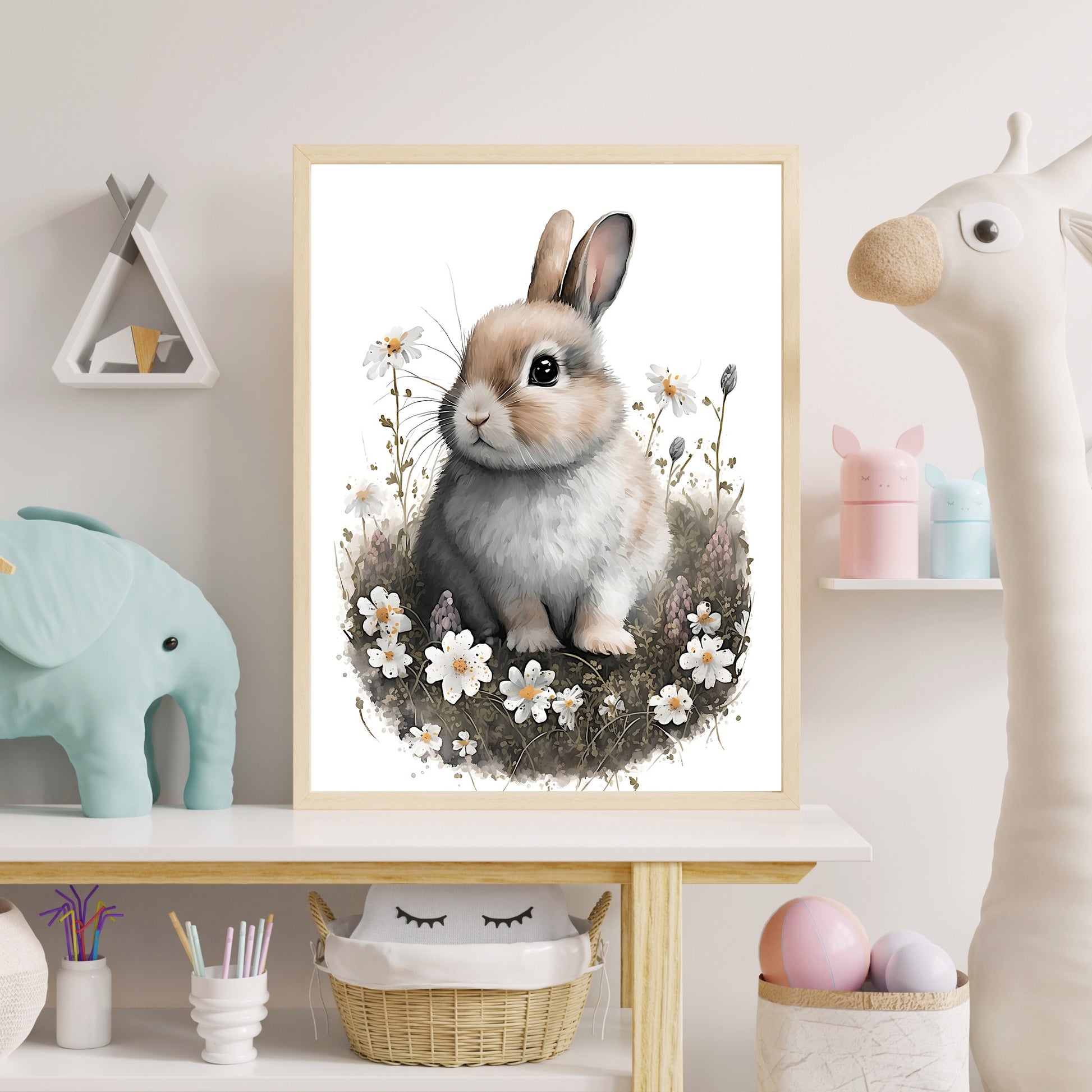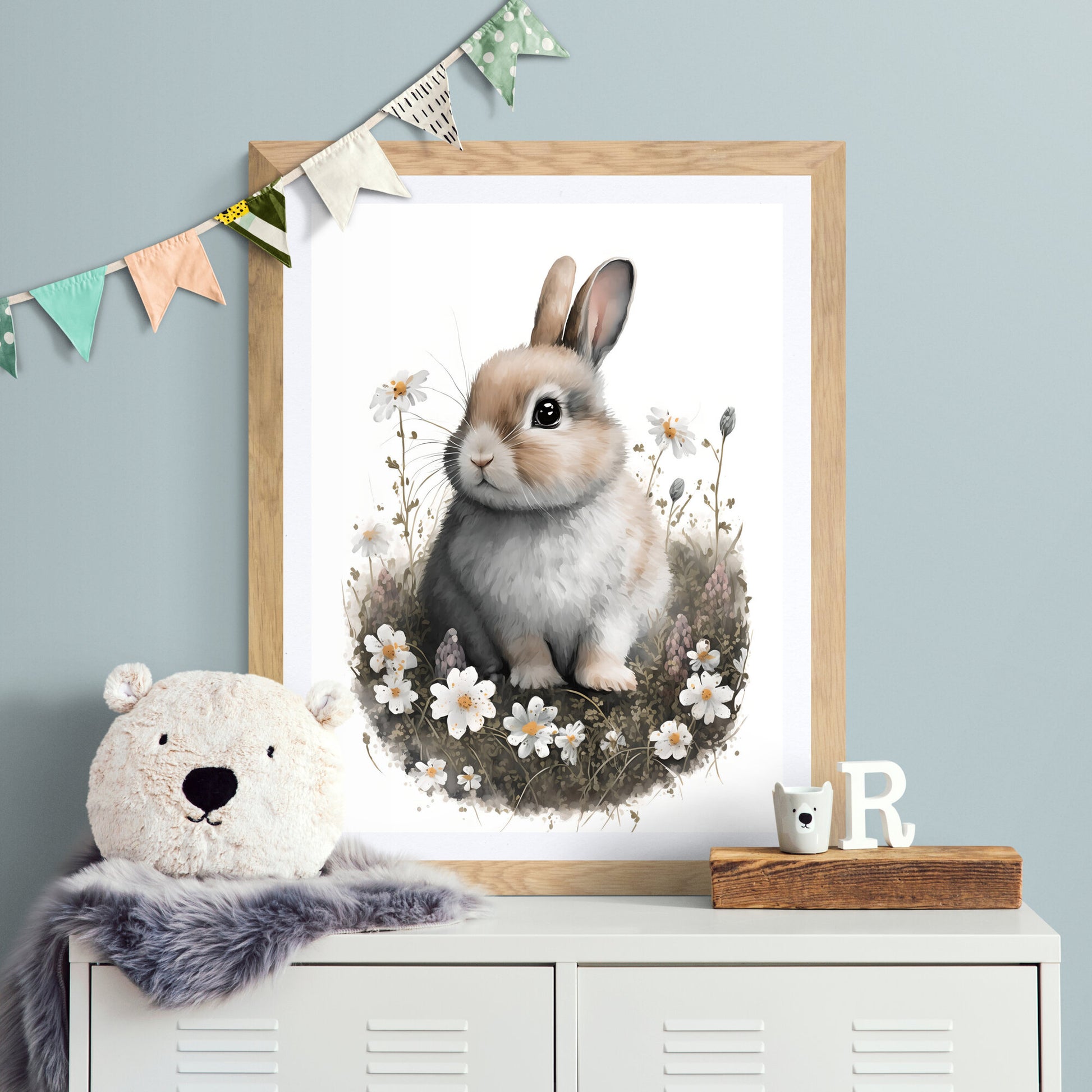 Baby-Häschen-Tier-Wandkunst, geschlechtsneutrales Tier-Kinderzimmer, Hase, Druck, Blumen, Baby-Häschen-Porträt, Papier-Posterdrucke