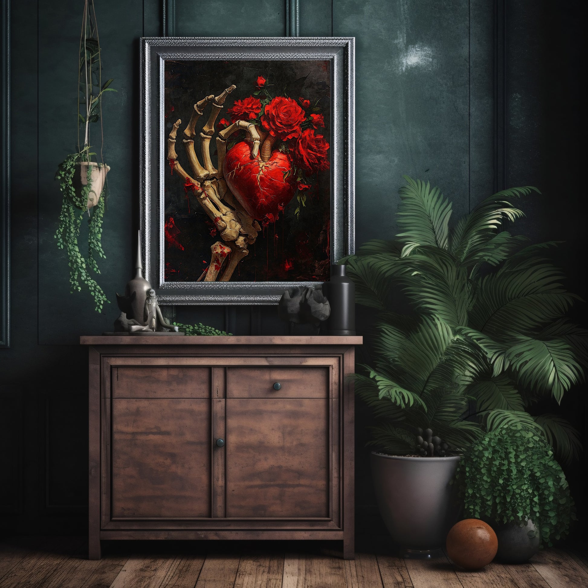 Gothic Valentine Gothic Wall Art Antique Oil Painting Skeletal Hand holding Heart and Roses Gothic Decor Goblincore Dark Romance Print Paper Poster Print
