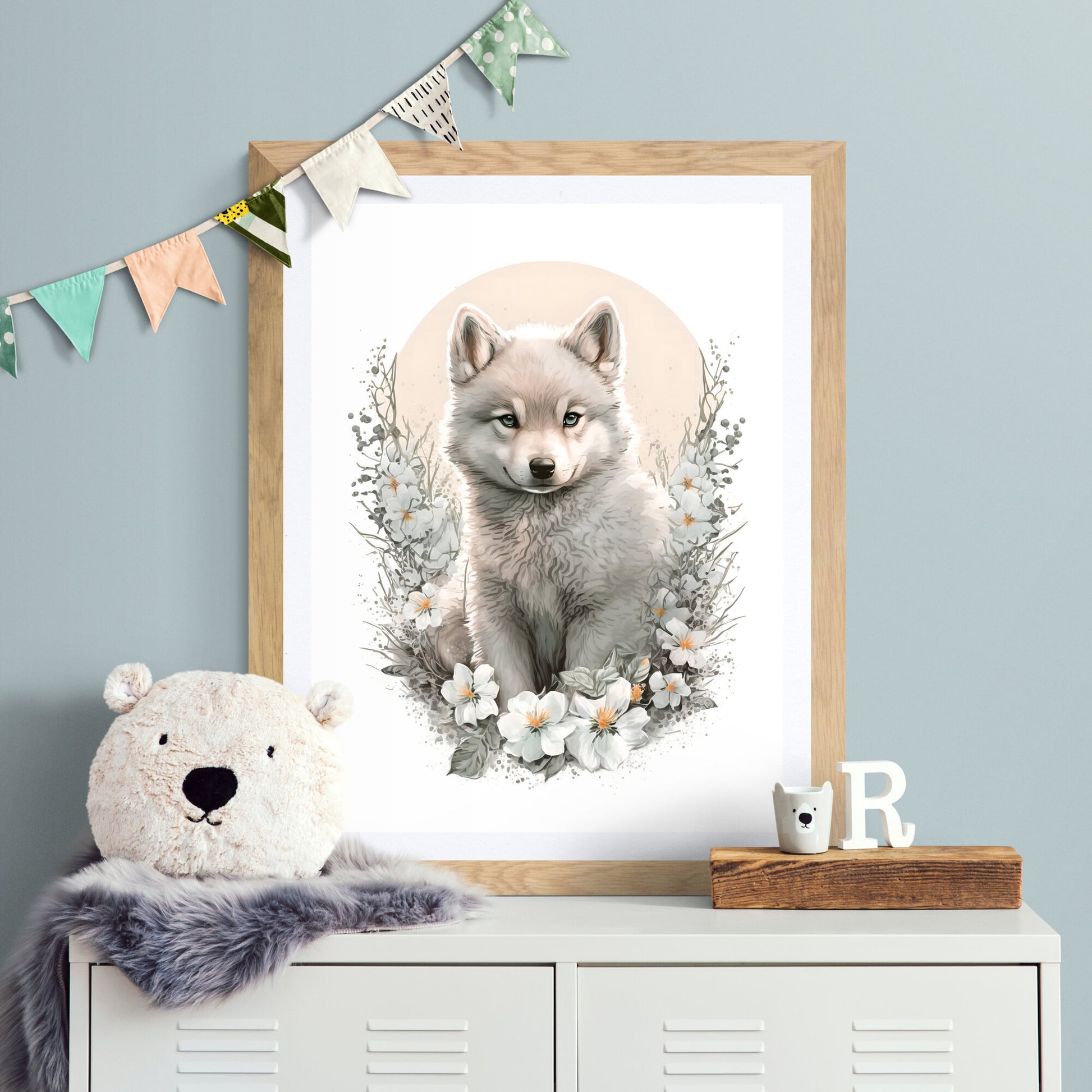 Baby wolf animal wall art gender neutral animal nursery wolf printing flowers baby wolf portrait Paper Poster Prints
